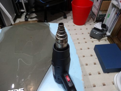 ヒートガンであぶってなるべく曲げておきます。
